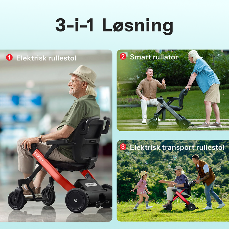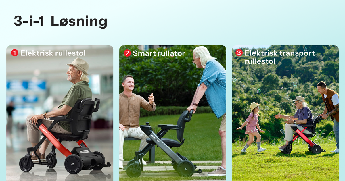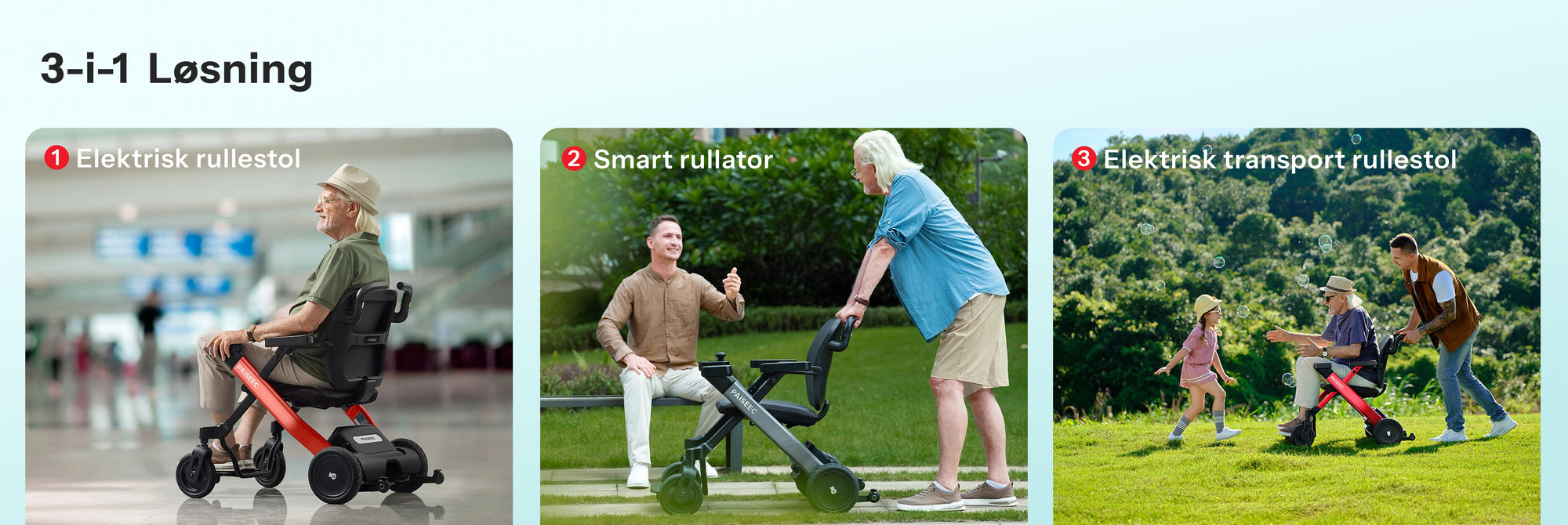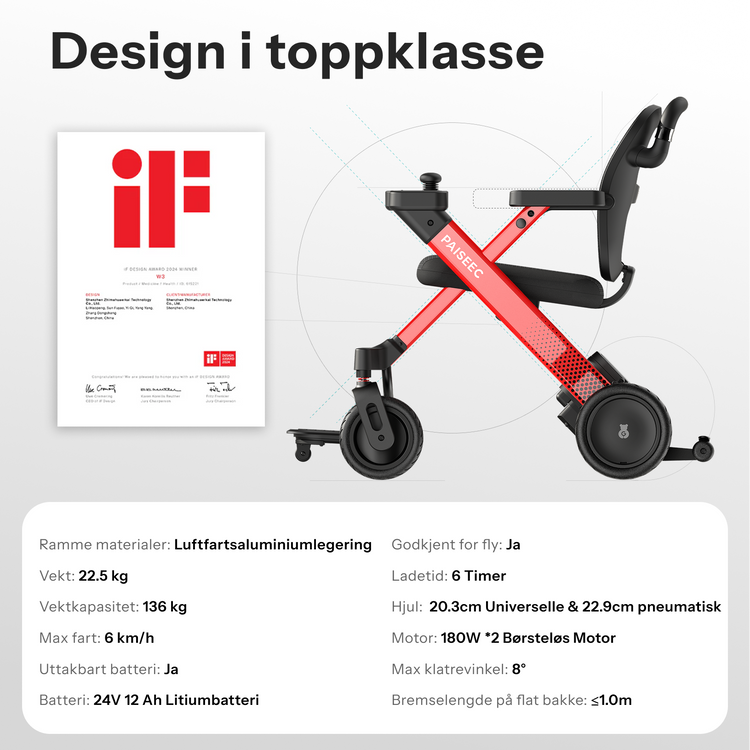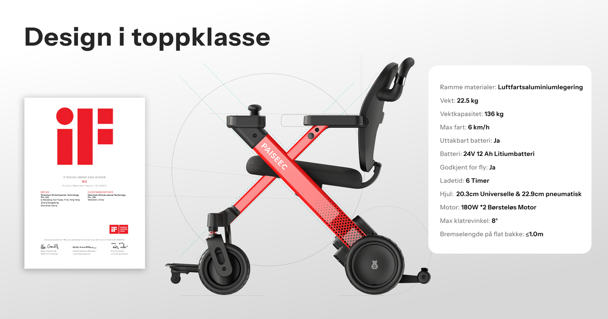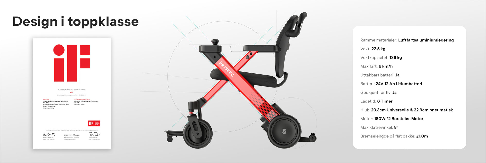 - Sikkerhet ved sensorer i sete og håndtak så den ikke akselererer uten at noen sitter på sete eller holder i håndtakene.